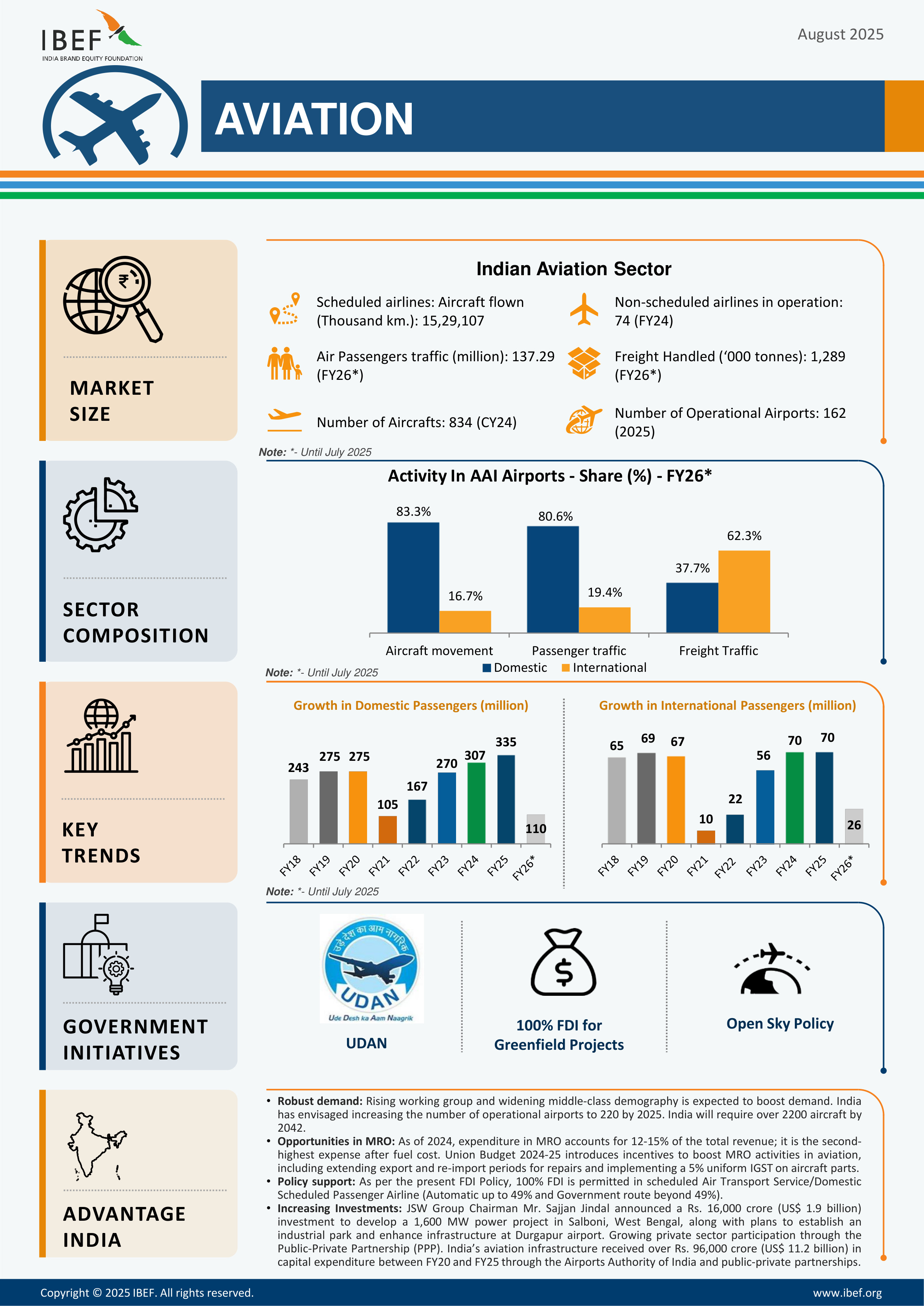 * India’s aviation infrastructure received over Rs. 96,000 crore (US$ 11.2 billion) in capital expenditure between FY20 and FY25 through the Airports Authority of India and public-private partnerships.