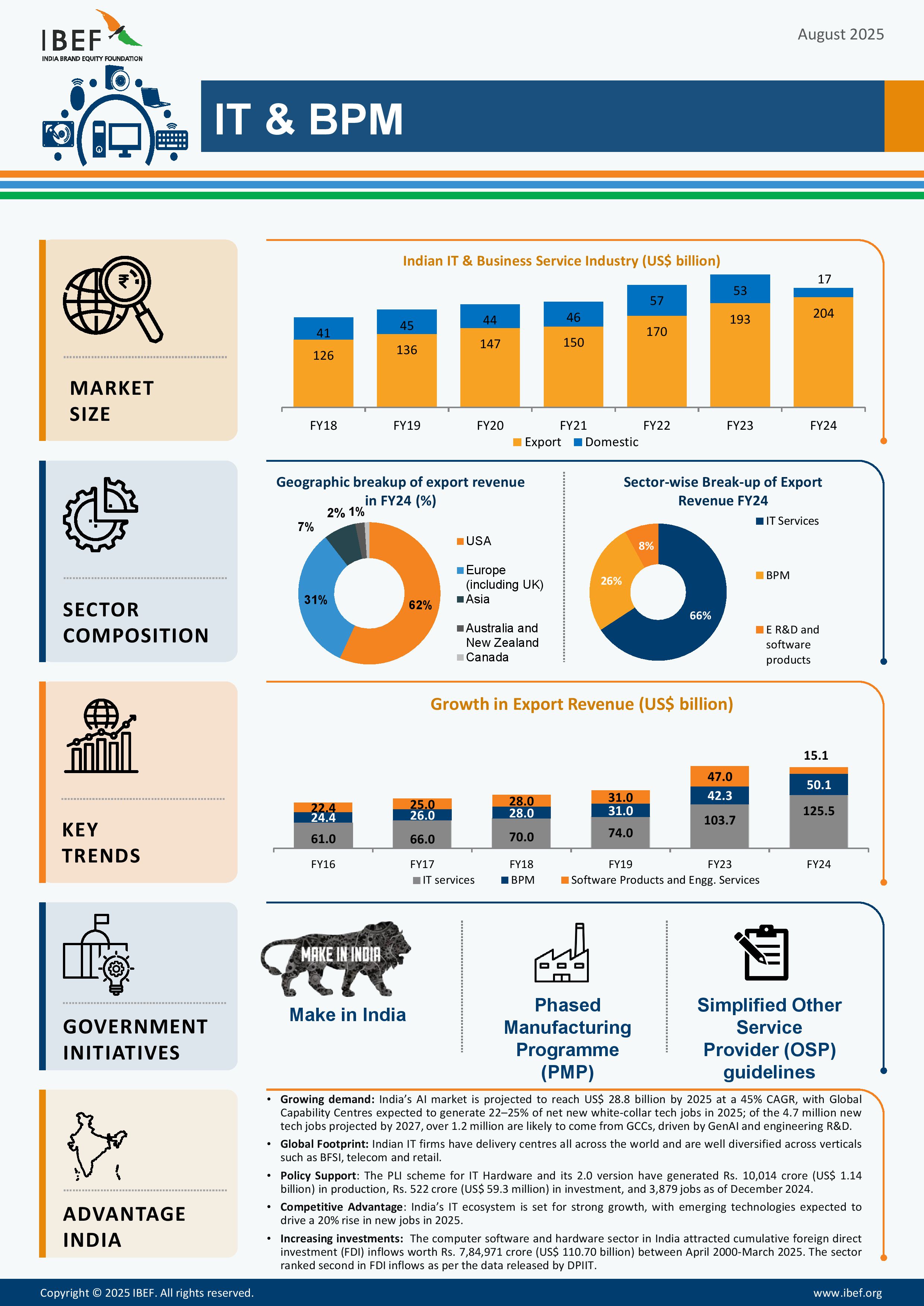 *India’s IT ecosystem is set for strong growth, with emerging technologies expected to drive a 20% rise in new jobs in 2025. By 2025, the Indian software product industry is projected to hit Rs. 8,62,000 crore (US$ 100 billion) as companies seek to expand globally.
