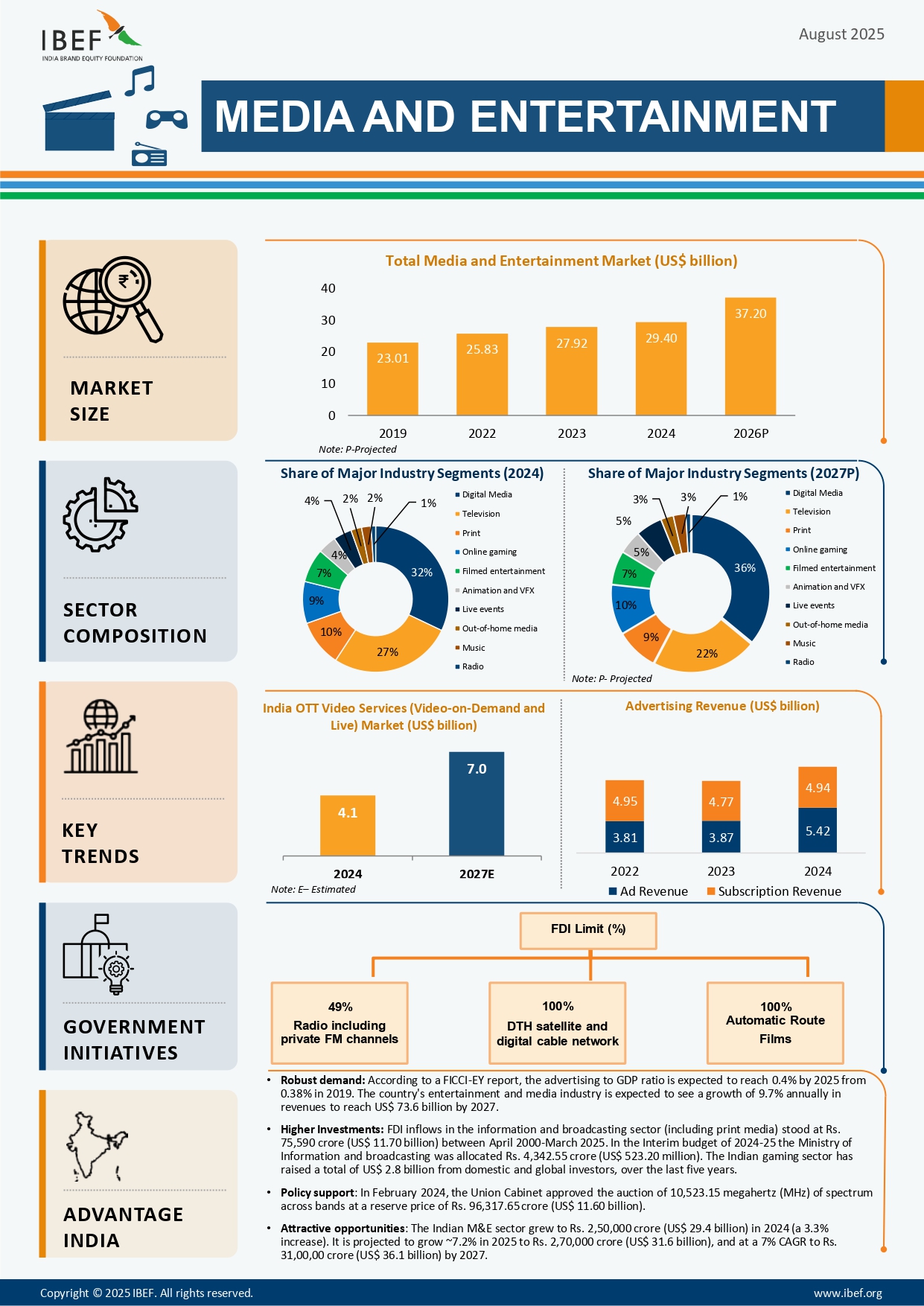 *The country's entertainment and media industry is expected to see a growth of 9.7% annually in revenues to reach US$ 73.6 billion by FY27.