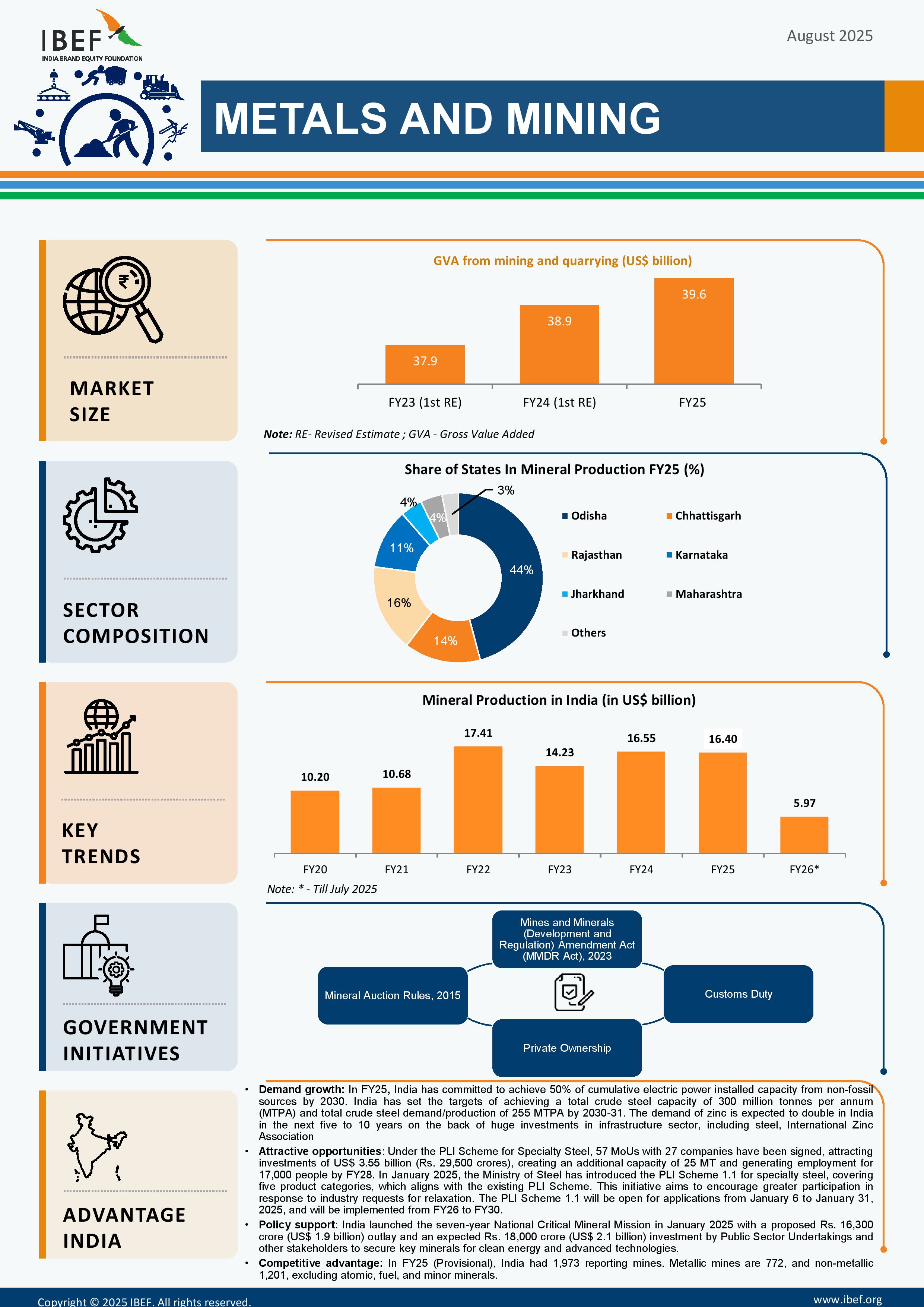 * India launched the seven-year National Critical Mineral Mission in January 2025 with a proposed Rs. 16,300 crore (US$ 1.9 billion) outlay and an expected Rs. 18,000 crore (US$ 2.1 billion) investment by Public Sector Undertakings and other stakeholders to secure key minerals for clean energy and advanced technologies.