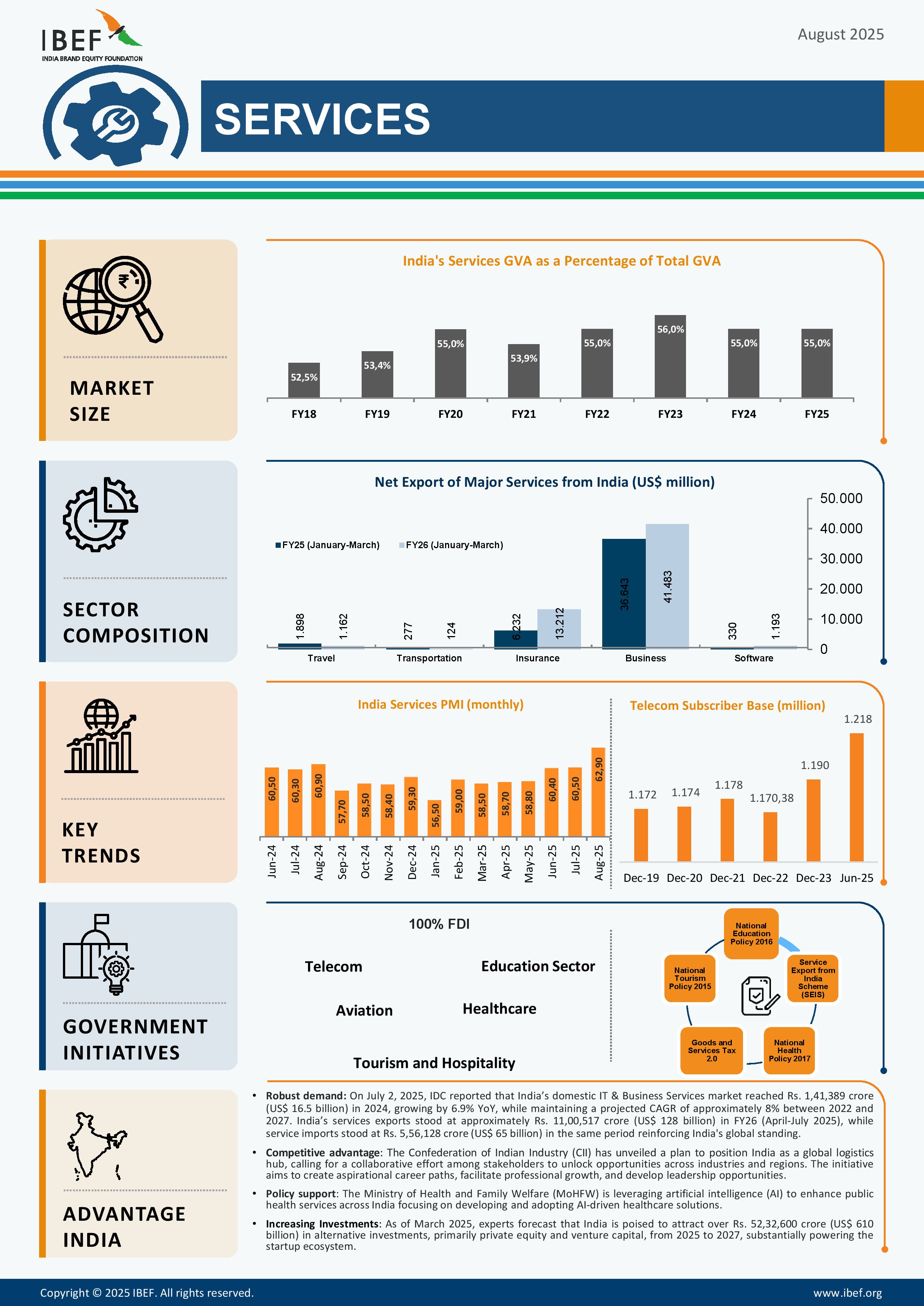 *India’s services exports stood at approximately Rs. 11,00,517 crore (US$ 128 billion) in FY26 (April-July 2025), while service imports stood at Rs. 5,56,128 crore (US$ 65 billion) in the same period reinforcing India's global standing.
