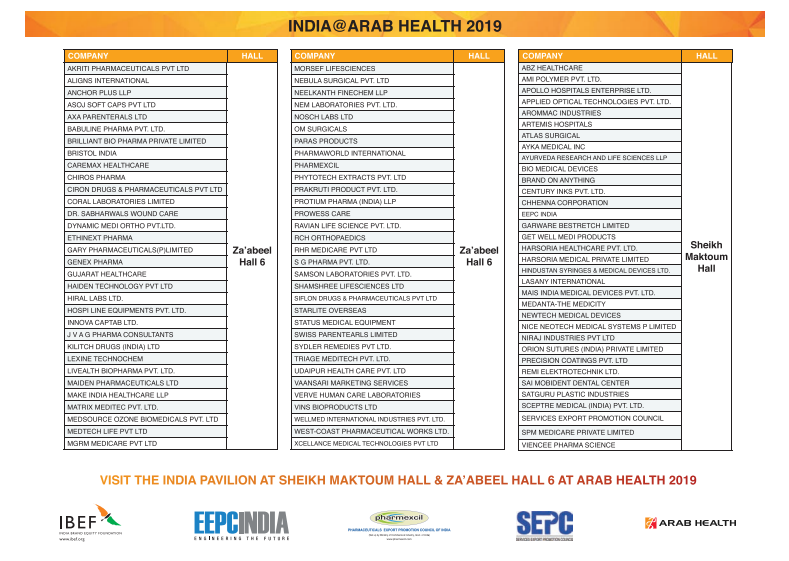 Over 100 Indian companies are expected to participate at Arab Health 2019 as part of the India Pavilion. The strong Indian contingent will showcase a wide range of services across the healthcare spectrum, viz. medical devices, state-of-the-art medical infrastructure, pharmaceuticals and capabilities in manufacturing of medical devices and its overall approach towards healthcare. The various products and services being showcased as part of the India Pavilion are located as follows: