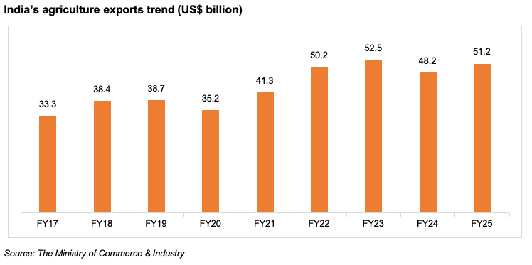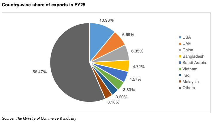 The largest importers of India’s agricultural products, as of FY25 (until December 2024), were the USA, UAE, China, Bangladesh. During this period, the USA was the largest importer of Indian agricultural products at Rs. 36,117 crore (US$ 4.19 billion) with a share of 11.36% of the total exports. The USA and China were the major importers of India’s marine products.