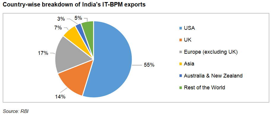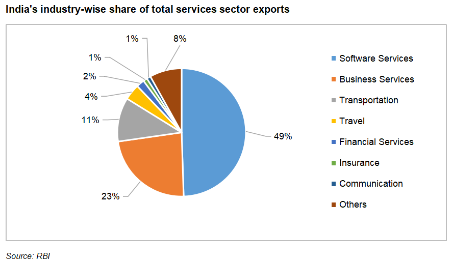 India’s share in global services exports has been steadily rising for the last two decades. India ranks seventh globally, representing a 4.3% share in the global services export. It accounts for over 50% of the GDP of India. The services sector in India comprises trade, tourism, aviation, telecom, shipping, ports, communication and storage, financing, insurance, transportation, real estate, business services, software services, IT-BPM, etc.