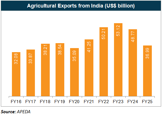 * India’s agriculture and fisheries exports grew from Rs. 2,49,264 crore (US$ 35.16 billion) in FY20 to Rs. 4,33,819 crore (US$ 51.23 billion) in FY25, recording 7.82% CAGR and reflecting strong demand growth.