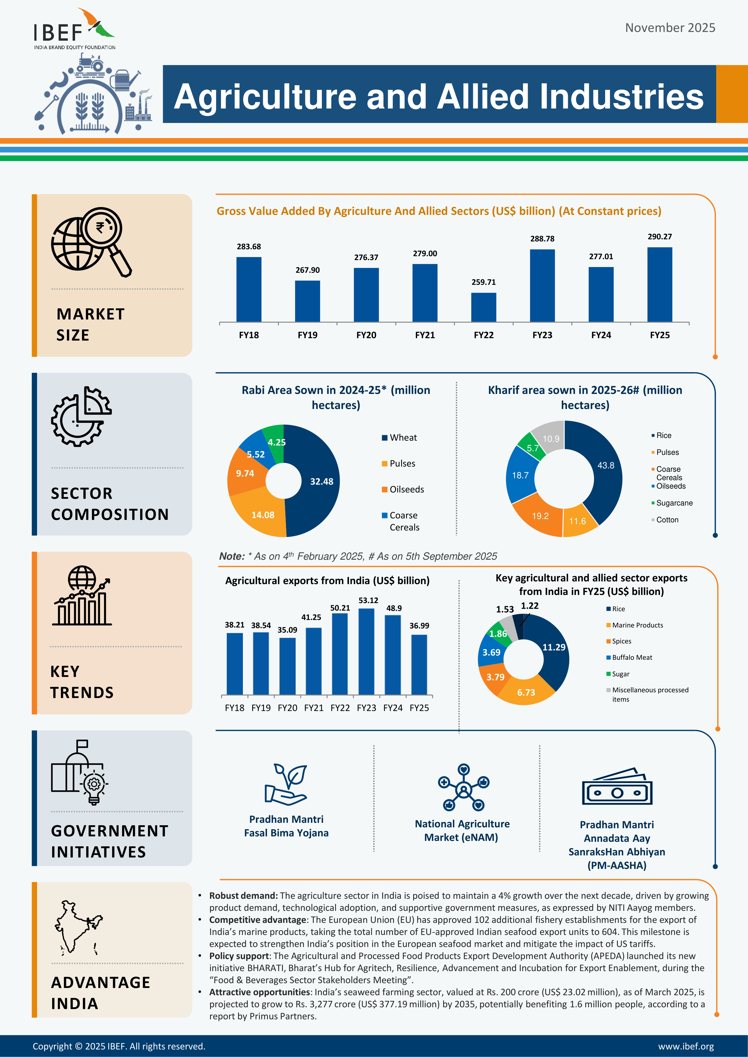 * The Union Cabinet approved the Prime Minister Dhan-Dhaanya Krishi Yojana (PMDDKY) worth Rs. 24,000 crore (US$ 2.79 billion) from FY26 to boost farm productivity, irrigation, credit access, and post-harvest infrastructure for 1.7 crore farmers across 100 districts