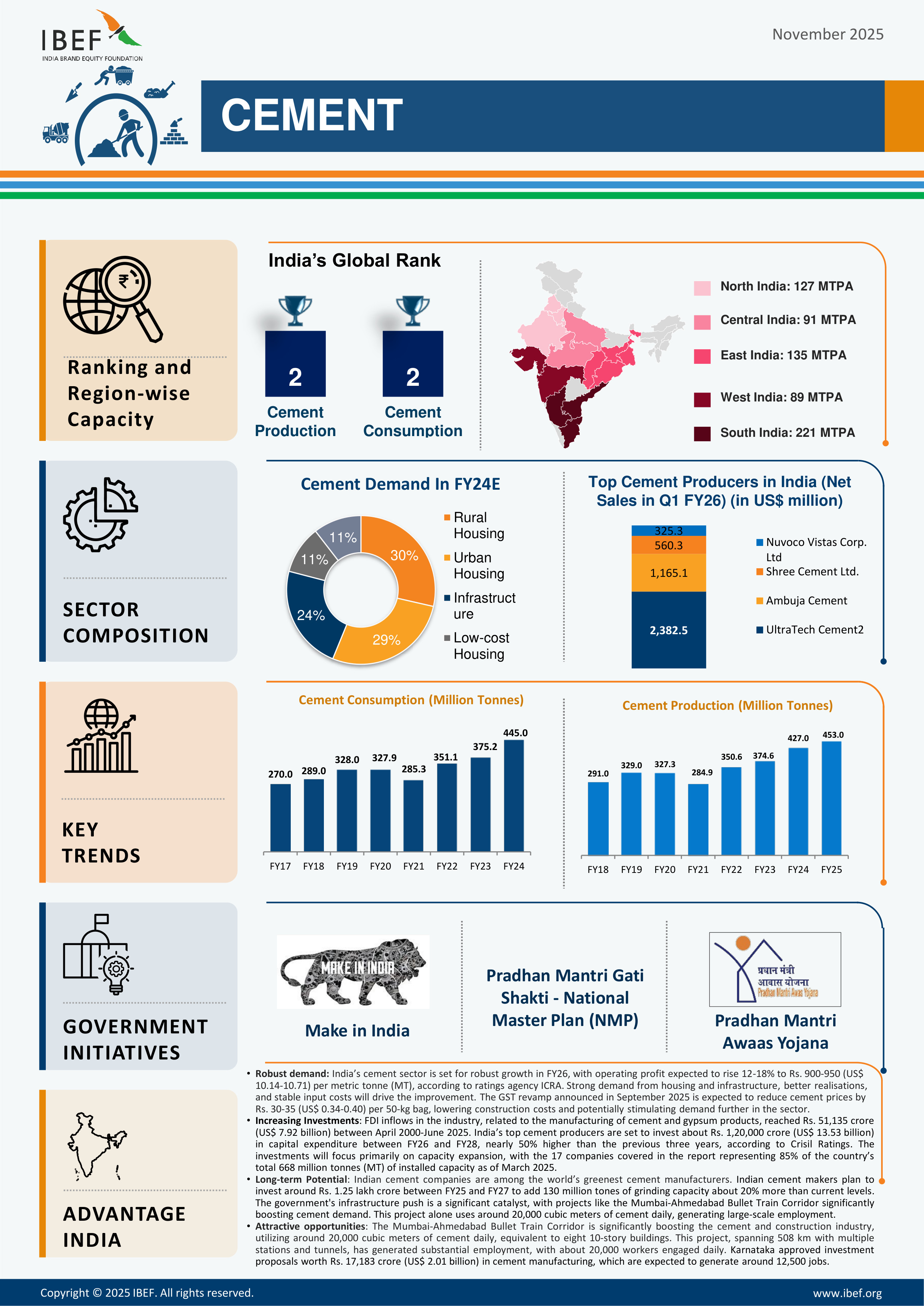 *In FY25, India’s cement production rose to about 453 million tonnes, up from 426.29 million tonnes in FY24, registering a 6.3% YoY growth.