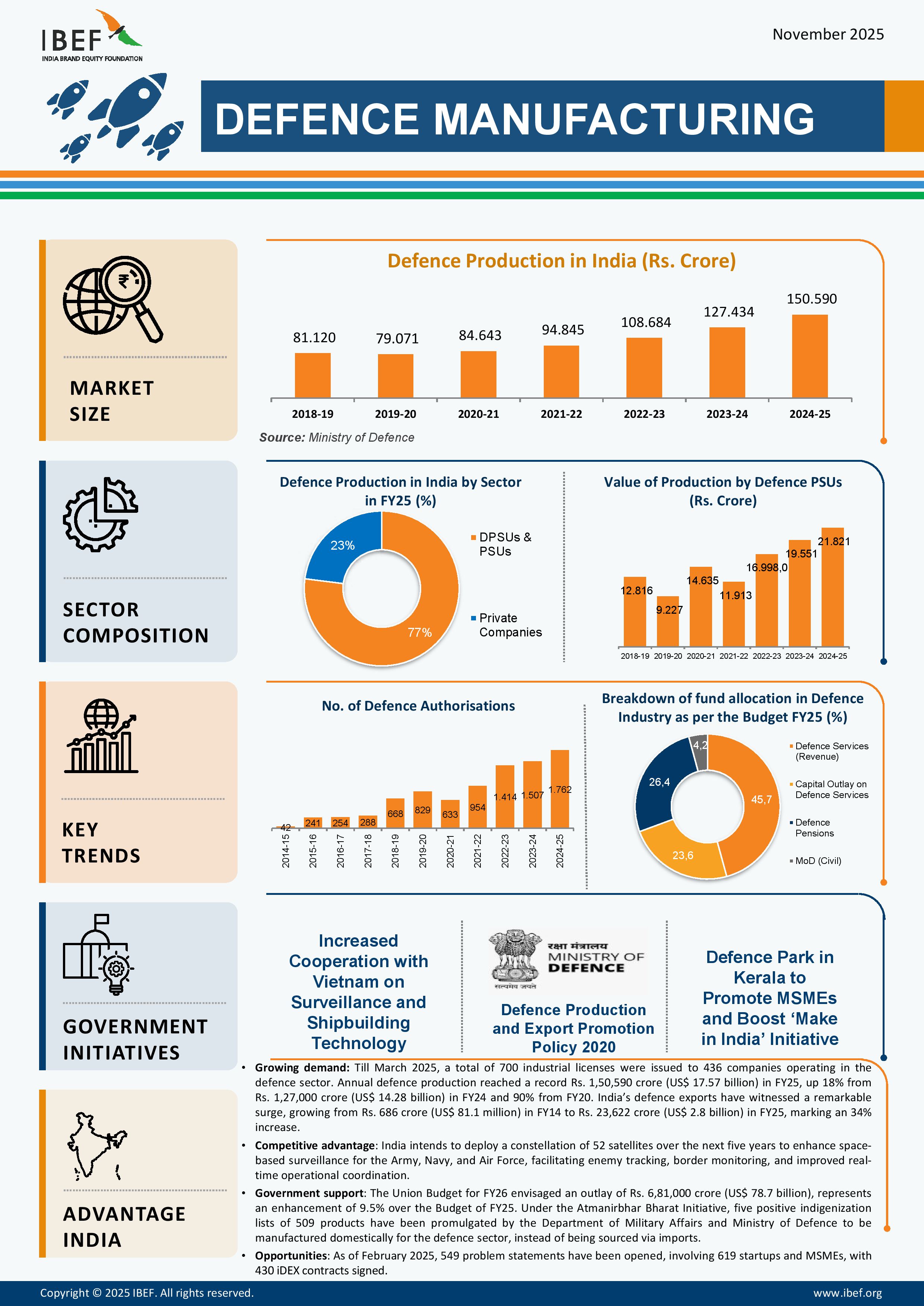 *Annual defence production reached a record Rs. 1,50,590 crore (US$ 17.57 billion) in FY25, up 18% from Rs. 1,27,000 crore (US$ 14.28 billion) in FY24 and 90% from FY20.