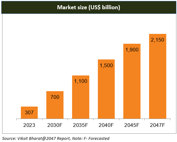 *According to the Viksit Bharat@2047 report, India's food processing sector will grow significantly, reaching US$ 1,100 billion by FY35, US$ 1,500 billion by FY40, US$ 1,900 billion by FY45, and US$ 2,150 billion by FY47.