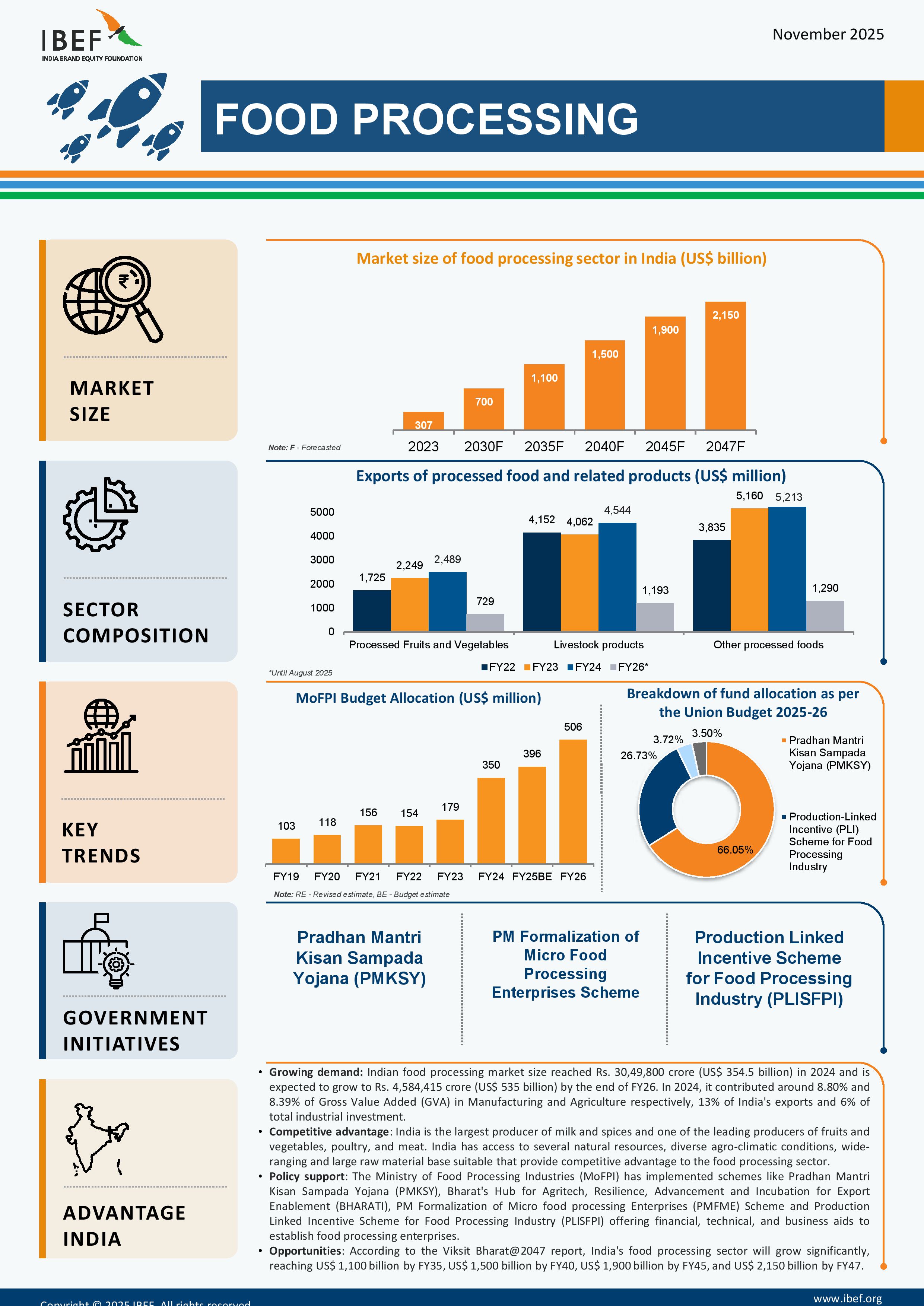 *According to the Viksit Bharat@2047 report, India's food processing sector will grow significantly, reaching US$ 1,100 billion by FY35, US$ 1,500 billion by FY40, US$ 1,900 billion by FY45, and US$ 2,150 billion by FY47.