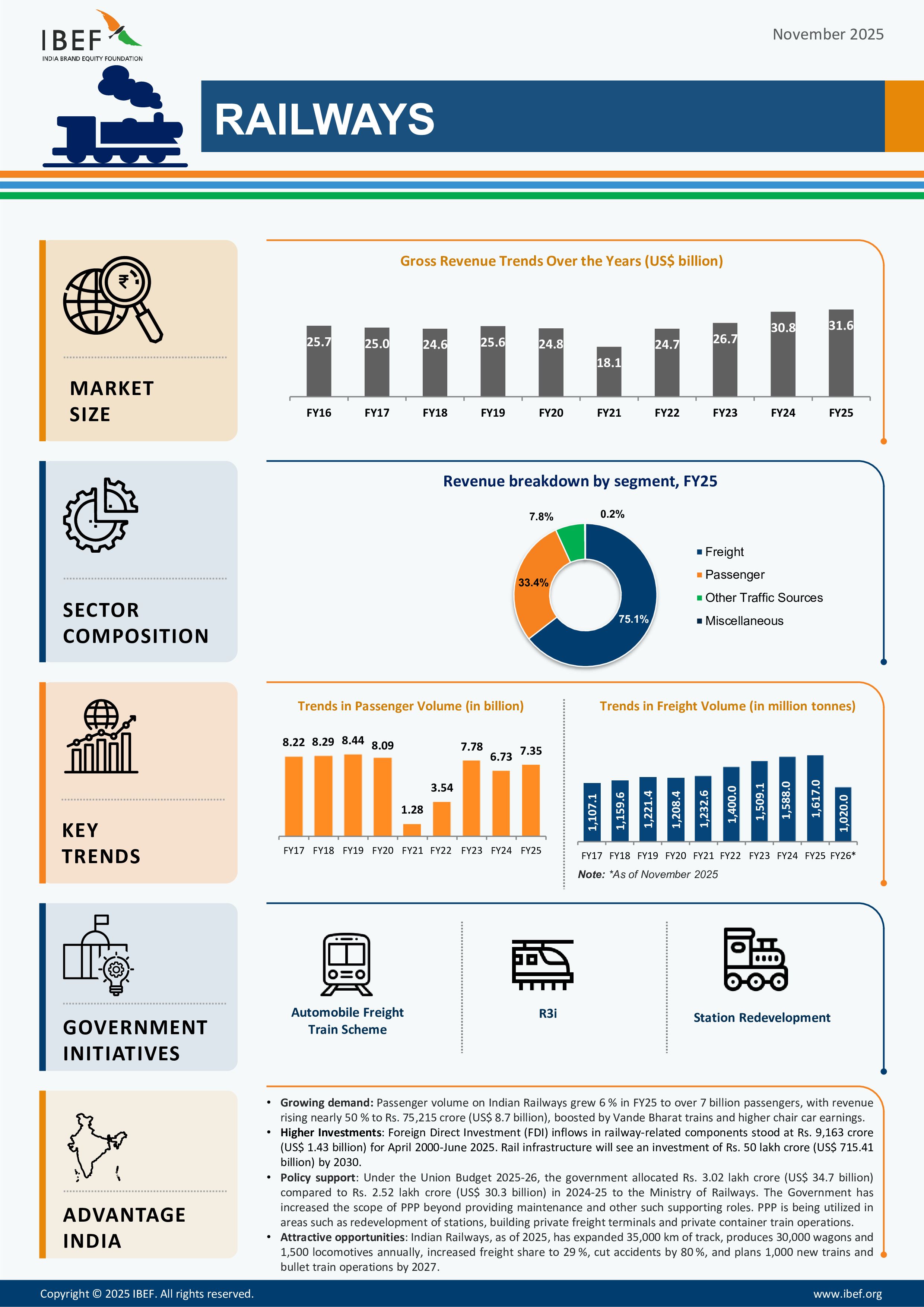* Passenger volume on Indian Railways grew 6 % in FY25 to over 7 billion passengers, with revenue rising nearly 50 % to Rs. 75,215 crore (US$ 8.7 billion), boosted by Vande Bharat trains and higher chair car earnings.