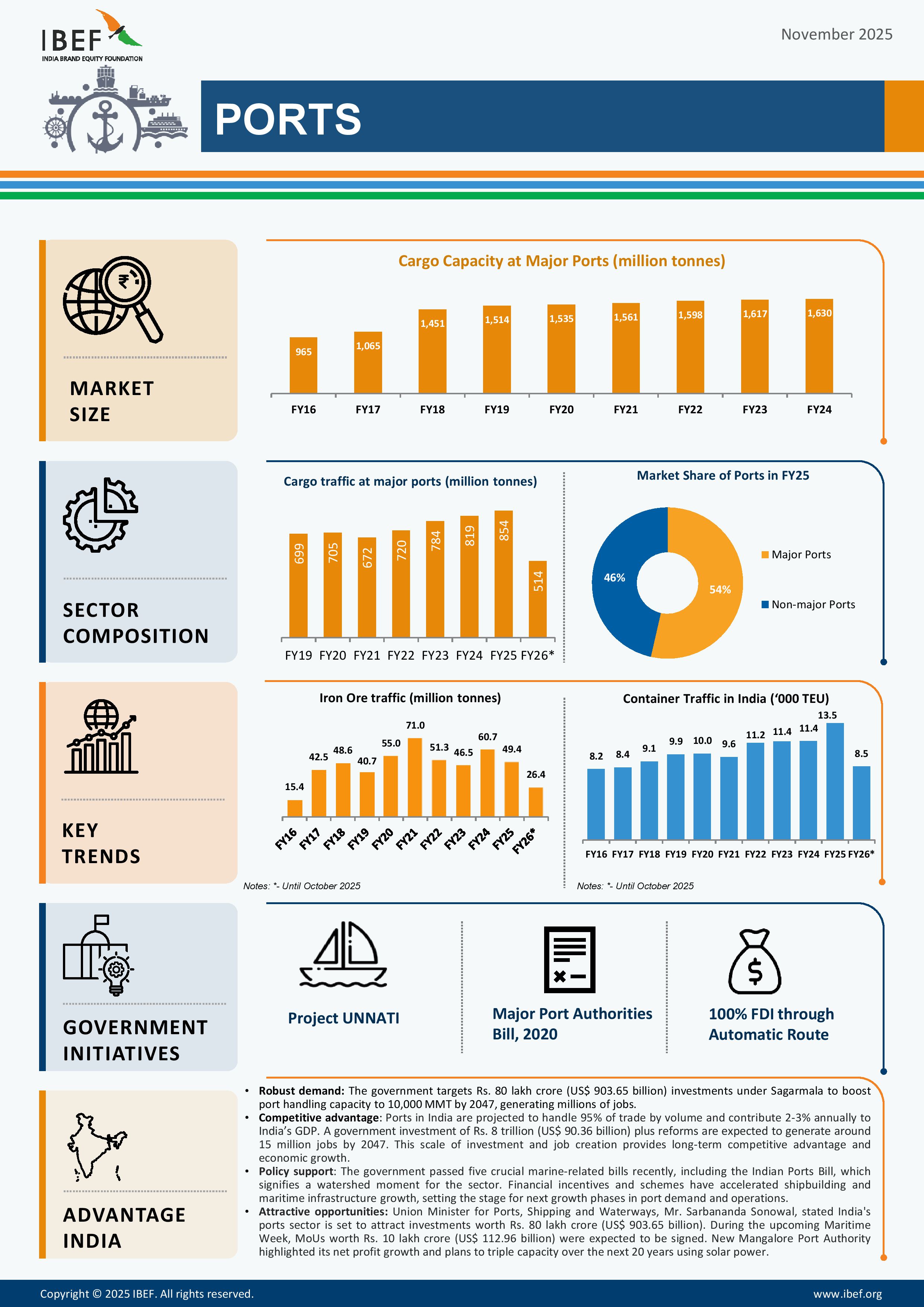 *The government targets Rs. 80 lakh crore (US$ 903.65 billion) investments under Sagarmala to boost port handling capacity to 10,000 MMT by 2047, generating millions of jobs.