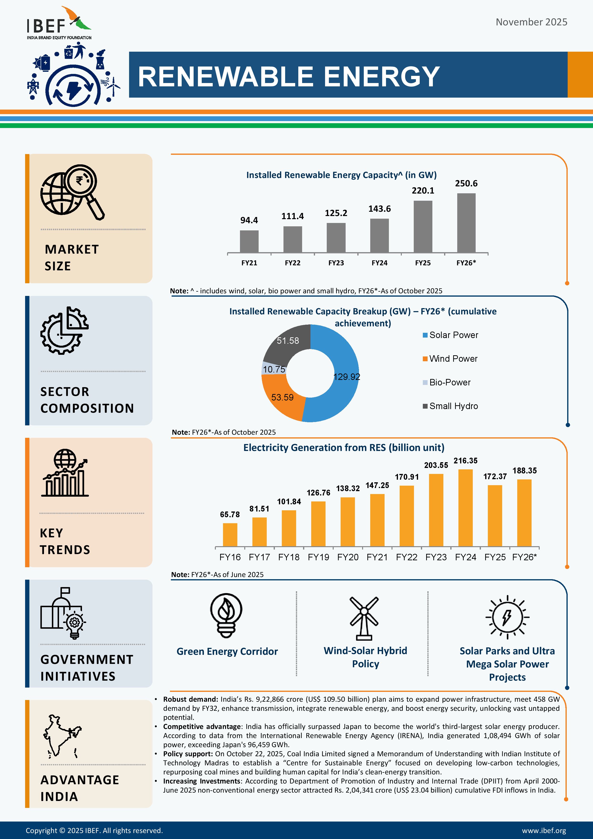 * According to Department of Promotion of Industry and Internal Trade (DPIIT) from April 2000 to June 2025 non-conventional energy sector attracted Rs. 2,04,341 crore (US$ 23.04 billion) cumulative FDI inflows in India.