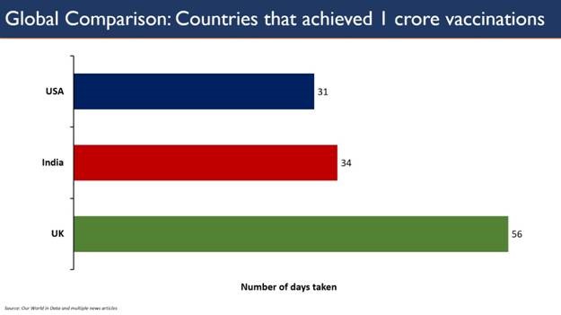 India took 34 days to achieve the landmark feat of 1 crore vaccinations, the second fastest in the world.