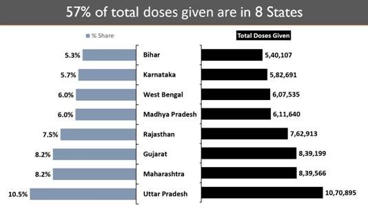8 States account for 57.47% of the total vaccine doses administered in India. Uttar Pradesh alone accounts for 10.5% (10,70,895).