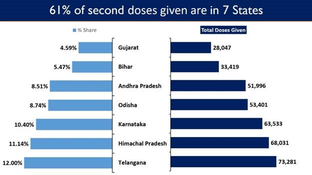7 States account for 60.85% of the second vaccine doses administered in India. Telangana leads all the states with a 12% share of second doses (73,281 beneficiaries) administered in the country.