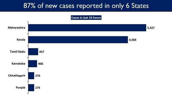 Maharashtra reports the highest daily new cases at 5,427. It is followed by Kerala with 4,584, while Tamil Nadu reported 457 new cases.