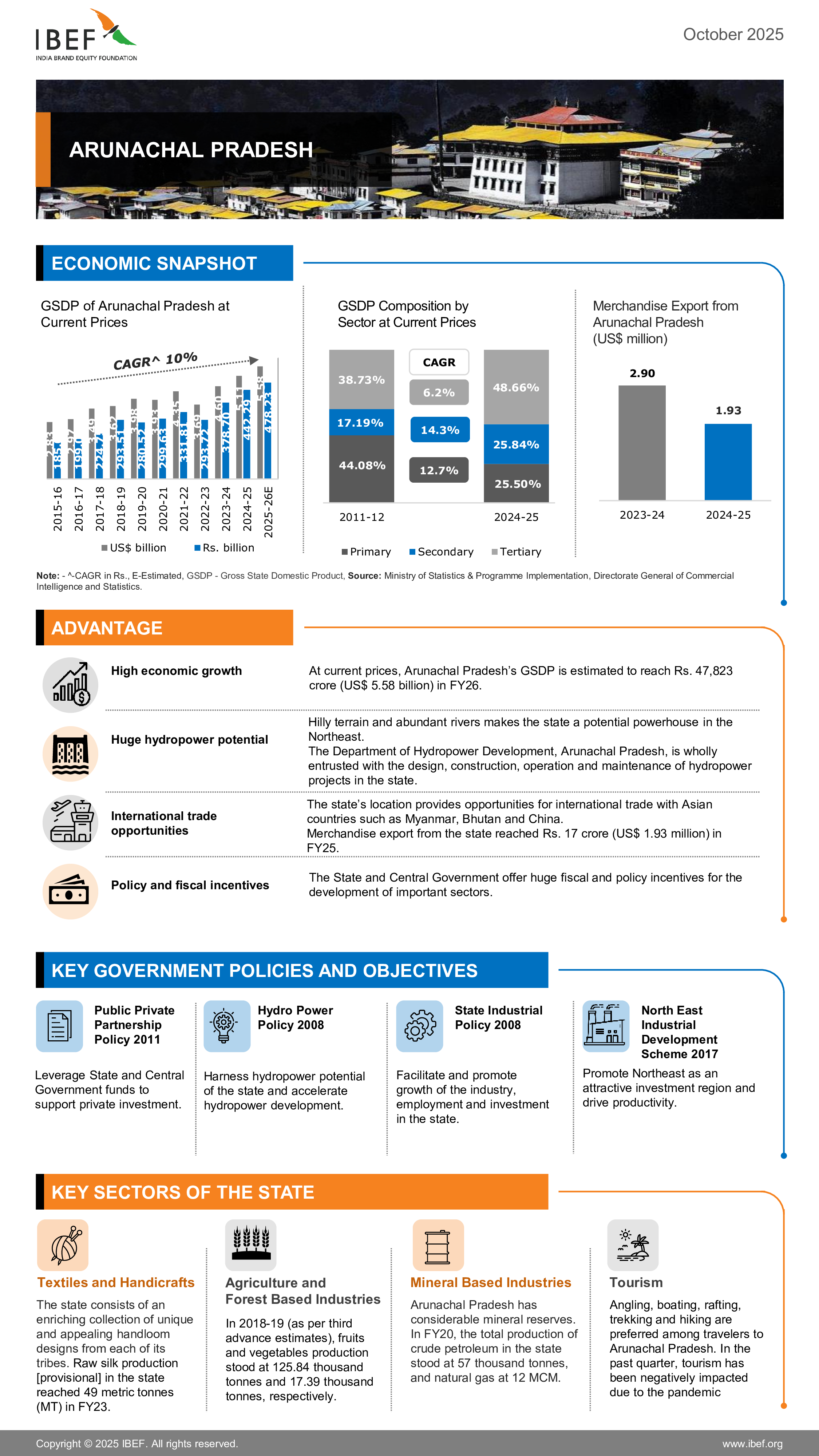 Arunachal Pradesh has an area of 83,743 sq km, and is the largest state in the Northeast of India that offers diverse topography opportunities for non-timber based industries such as bamboo, cane and medicinal plants.