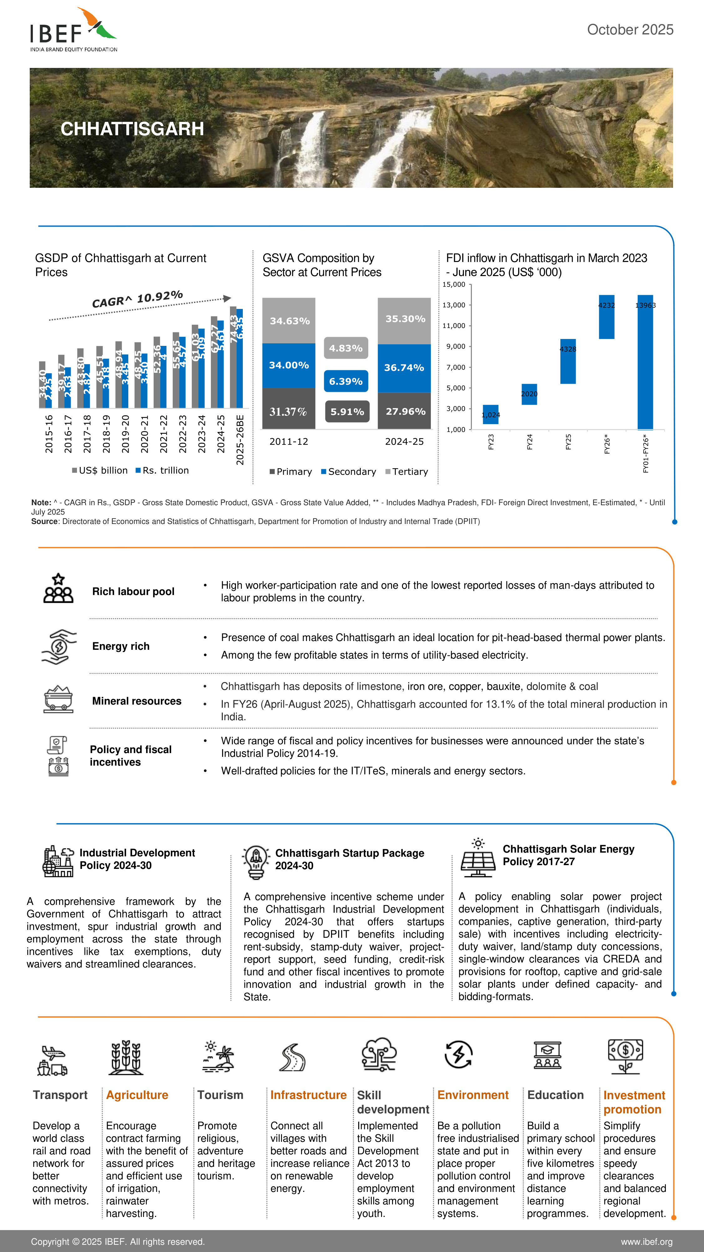 Chhattisgarh earned record revenue of Rs. 12,941 crore (US$ 1.57 billion) from minerals for the year 2022-23 and accounted for more than 17% of total mineral production in India.