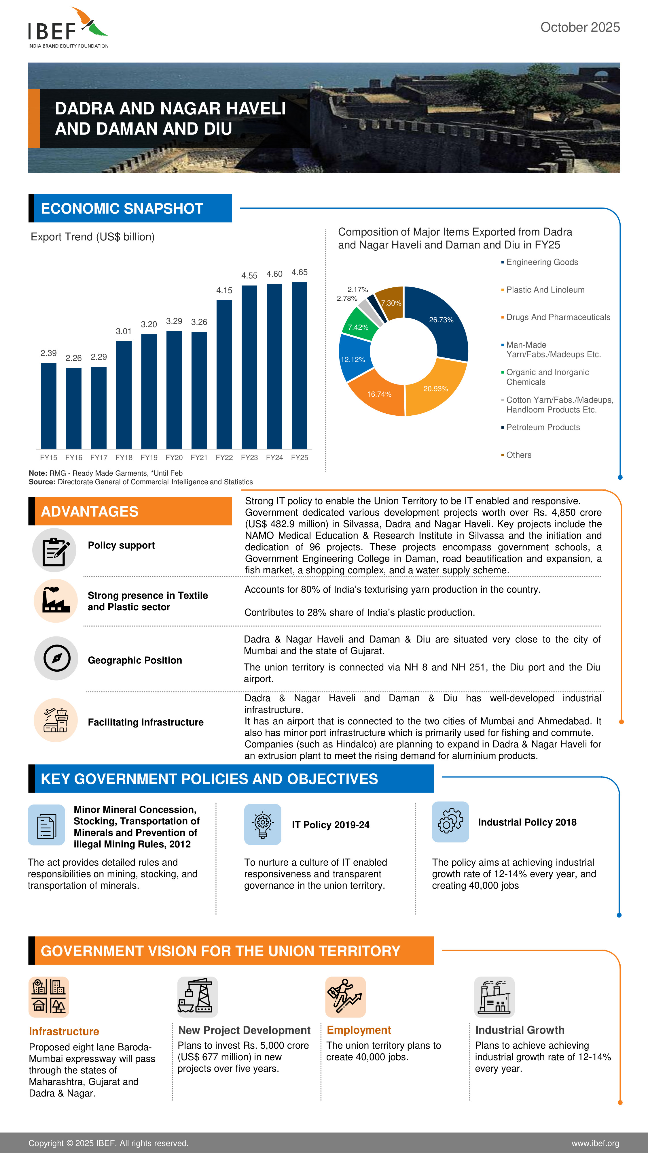 Dadra & Nagar Haveli and Daman & Diu are leaders in plasticisers and contribute to 28% of India’s plastic production in the form of aerospace, households, medical, green houses, defence and non-conventional energy.